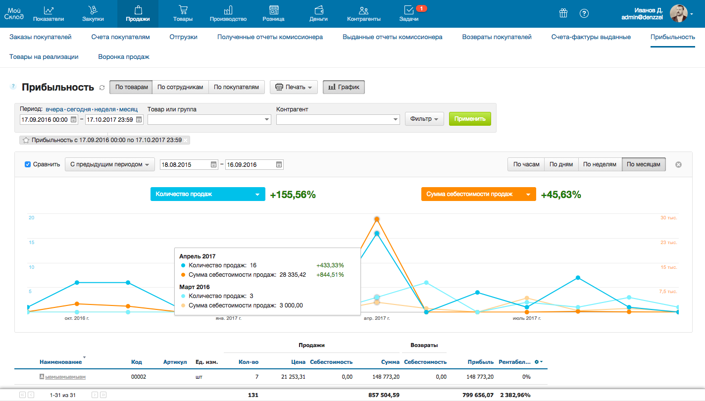 Готовые интеграции Интернет-магазин, Ozon, WB, ВКонтакте и другие. Заказы передаются в МойСклад, а остатки и цены — на все площадки сразу. Автоматизация Обработка заказов до 90% быстрее, чем вручную. Контроль и прогноз остатков. Ускоренная подготовка поставок. Аналитика Смотрите прибыль по каждому заказу, товару, каналу продаж. С учетом возвратов, комиссий и прочих затрат.